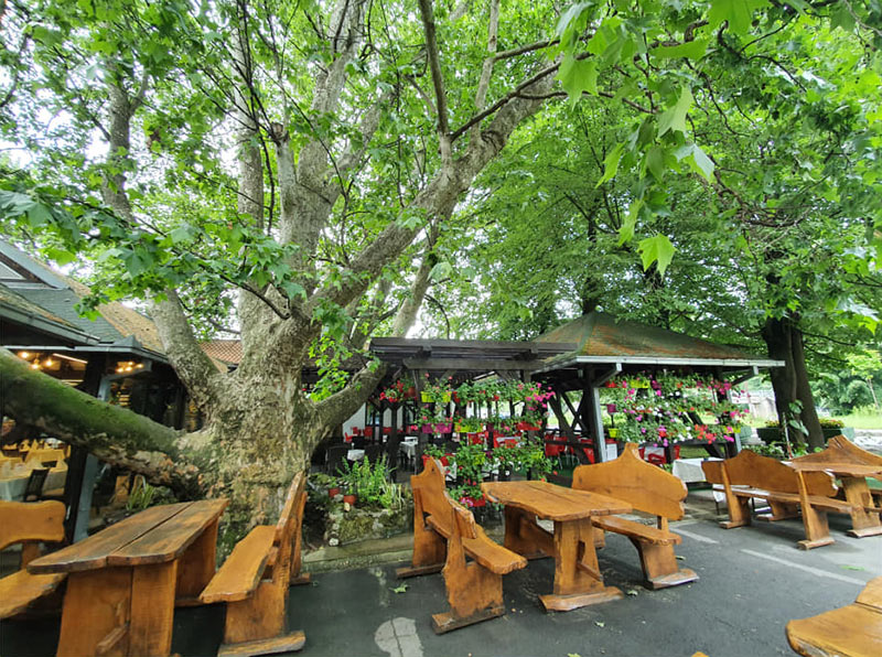 Ein großer Garten mit über 100 Sitzplätzen unter den Platanen bietet Ihnen im Sommer eine angenehme Atmosphäre, um unsere Spezialitäten der nationalen Küche zu genießen – darunter Grillgerichte, Eintöpfe, Spanferkel, Lamm- und Kalbfleisch unter der Glocke und vieles mehr.